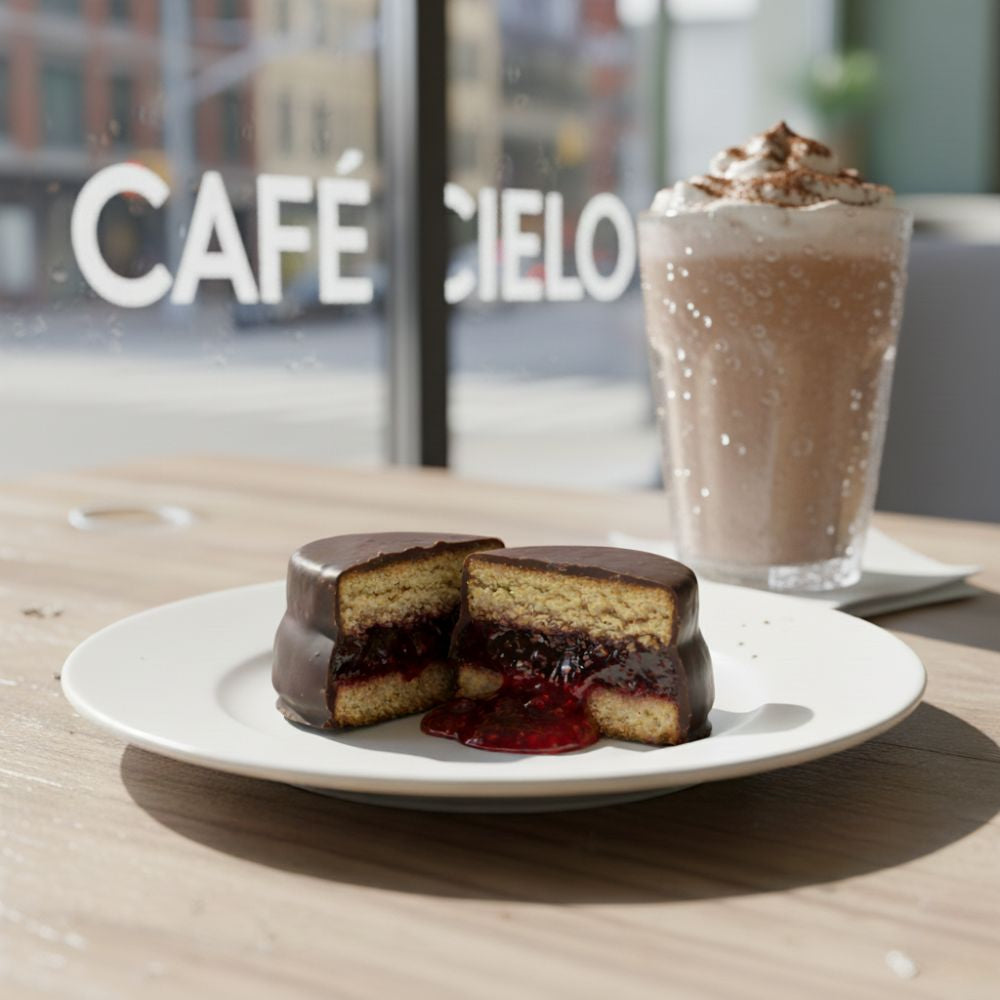 Ingredientes: Galleta de alfajor (harina de almendra, harina de nuez, harina de coco, alulosa, agua filtrada), mermelada frambuesa (frambuesa natural, alulosa, agar, goma xantan, sorbato de potasio 0,01%), chocolate 85% cacao (masa de cacao, manteca de cacao, lecitina de maravilla, alulosa). Alérgenos: Almendra y nueces.